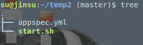 간단하게 프로젝트의 구조를 찍어봤다. 최상위에 appspec.yml과 start.sh가 위치해있다.