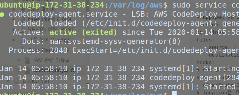 sudo service codedeploy-agent start && sudo service codedeploy-agent status 를 통해 codedeploy-agent를 실행시켜주고 Active한 상태인지 확인해본다.