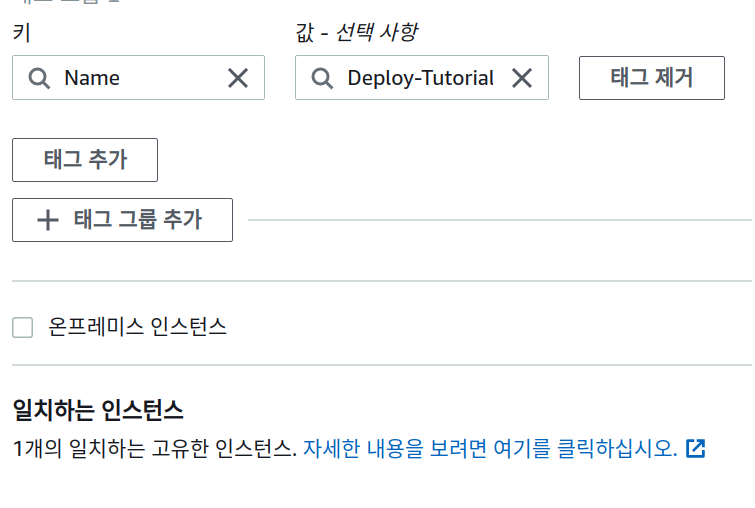 배포 방법은 간편하게 테스트 배포해보기만 할 용도이므로 현재위치(블루/그린X) 환경은 EC2 Instance, 아까 설정한 Instance의 이름을 통해 Instance를 필터해낸다.