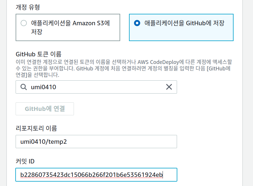 자신의 github과 연결 후 github repository와 commit id를 입력해준다.