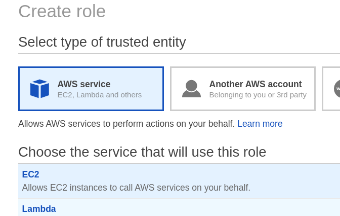 로 EC2 를 골라주고, 아무런 Policy를 선택하지 않은 채 Name만 적절히 설정해준 뒤 Role을 생성하자. (S3 를 이용할 경우라면 Policy를 골라주어야하는데 Github을 이용하면 아무 Policy도 필요없다. 형식적으로 Role만 설정해주면 된다. 굳이 왜 이렇게 하는 지 모르겠습니다. 아시는 분 계시면 알려주세요!)