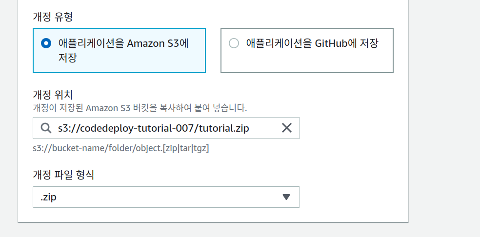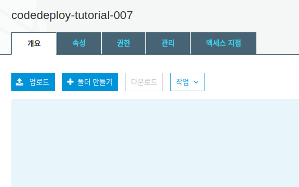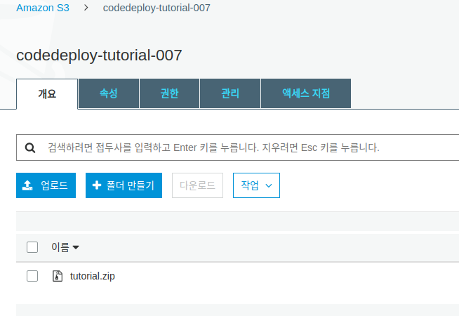 이렇게 난 codedeploy-tutorial-007이라는 버킷에 tutorial.zip 이라는 zip file을 업로드 했다.