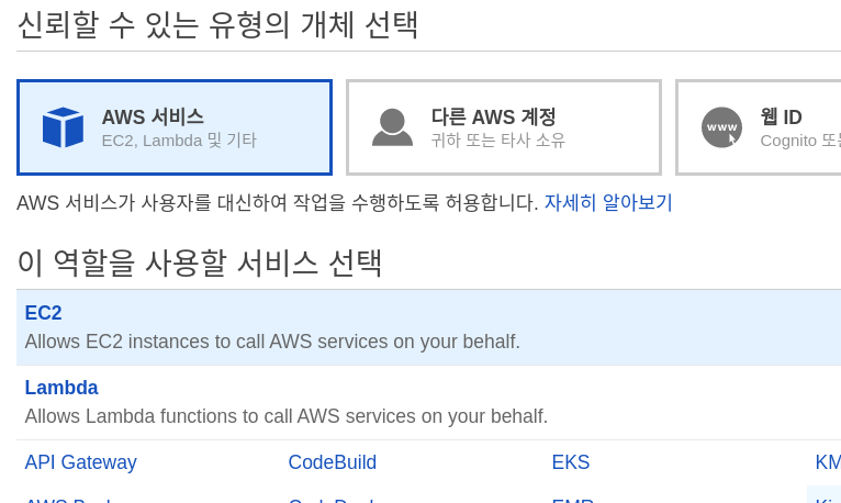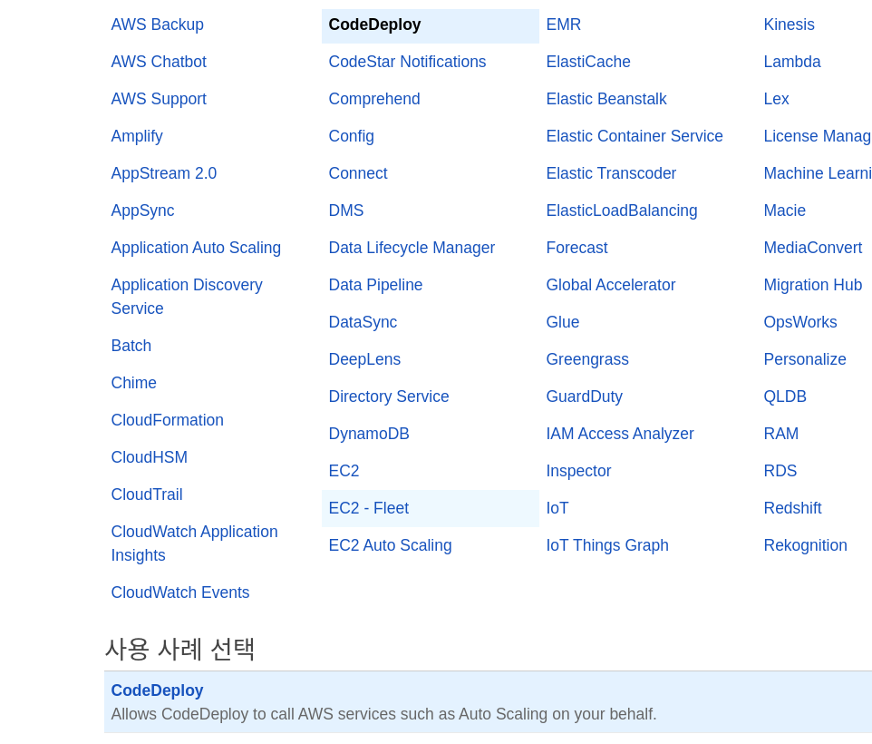 trusted entity(신뢰할 수 있는 개체)는 CodeDeploy로 선택. Use case(사용 사례)는 EC2에 배포할 것이므로 CodeDeploy를 선택해준다. 이후 Role은 어차피 AWSCodeDeployRole을 선택(어차피 이거밖에 안 뜰 것임).