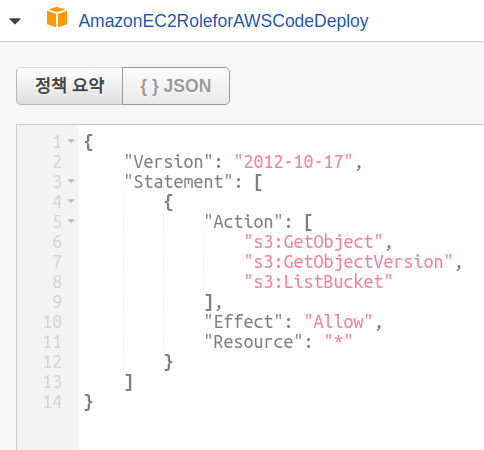 사진과 같이 Role의 이름은 AWSCodeDeploy를 위한 EC2의 Role이라고 하지만, 정작 내용은 S3 에 대한 내용. 따라서 꼭 EC2RoleforAWSCodeDeploy가 아니라 S3ReadOnly 등의 Policy를 부여해도 CodeDeploy가 잘 작동한다. 하지만 S3 Read에 관한 Role을 부여하지 않는다면 Access Denied!와 함께 CodeDeploy가 잘 작동하지 못한다.