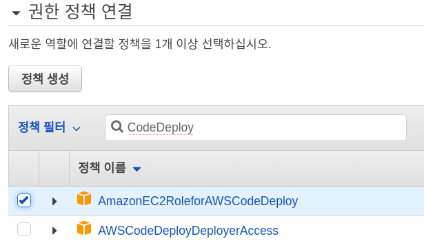 trusted entity(신뢰할 수 있는 개체)로 EC2 를 골라주고 Role의 Policy는 AmazonEC2RoleforAWSCodeDeploy 를 선택해준다. Role의 이름은 편한 대로 설정.