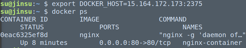 환경변수를 설정해주면, 환경변수가 유효한 동안은 -H옵션 없이 편하게 바로 원격으로 docker command를 이용할 수 있습니다.